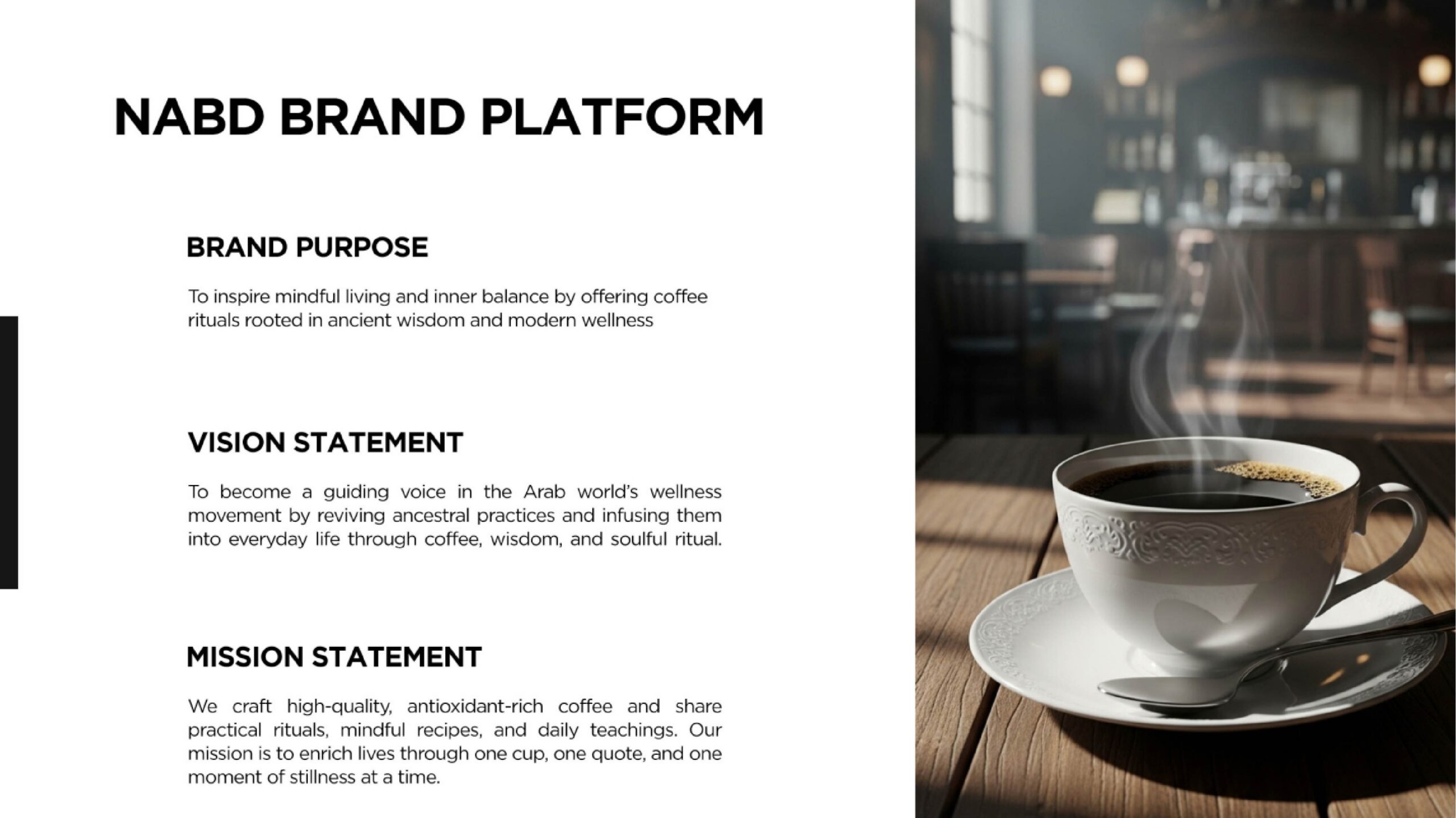 Based on its nature, the NABD brand cares about overall well-being, including mental and spiritual health. This gives the brand the potential to create a new subcategory within the coffee market, and so we did.