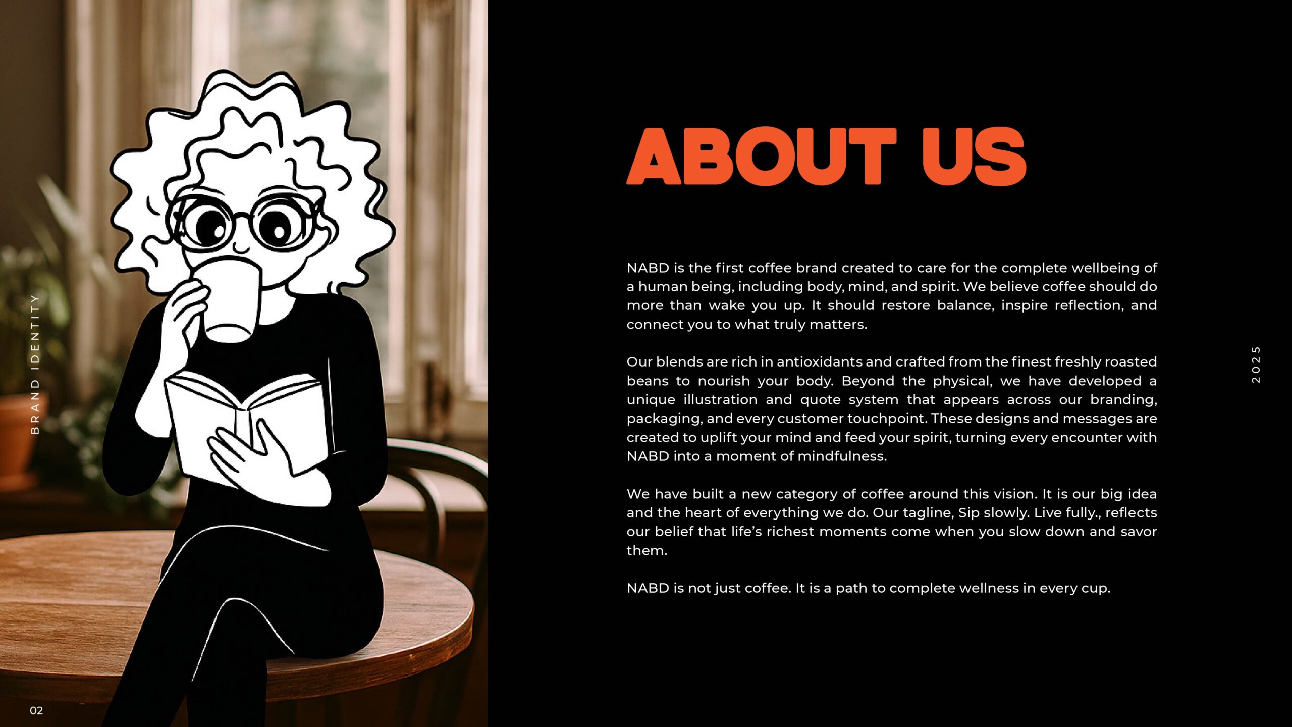 Our big idea, Wellness in Every Sip, is the heart of NABD. It is the reason we carefully select our beans, craft our roasts, and design our packaging. It is why every detail, from the flavor in your cup to the message in your hands, is created to help you slow down, be present, and live more fully.